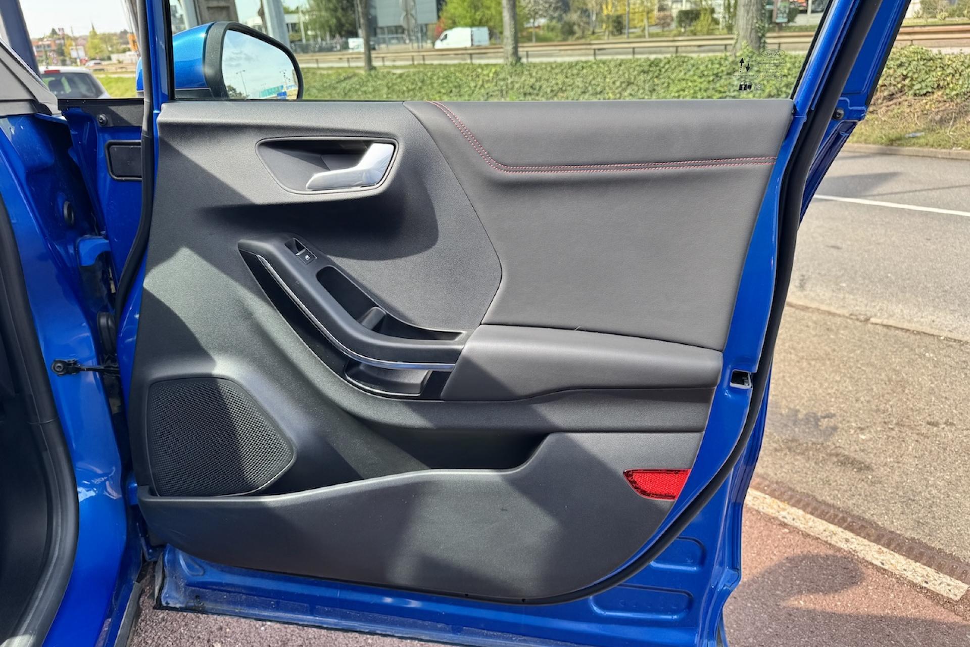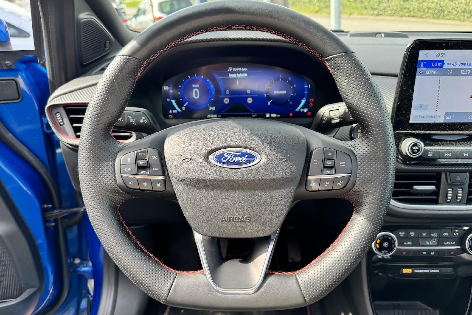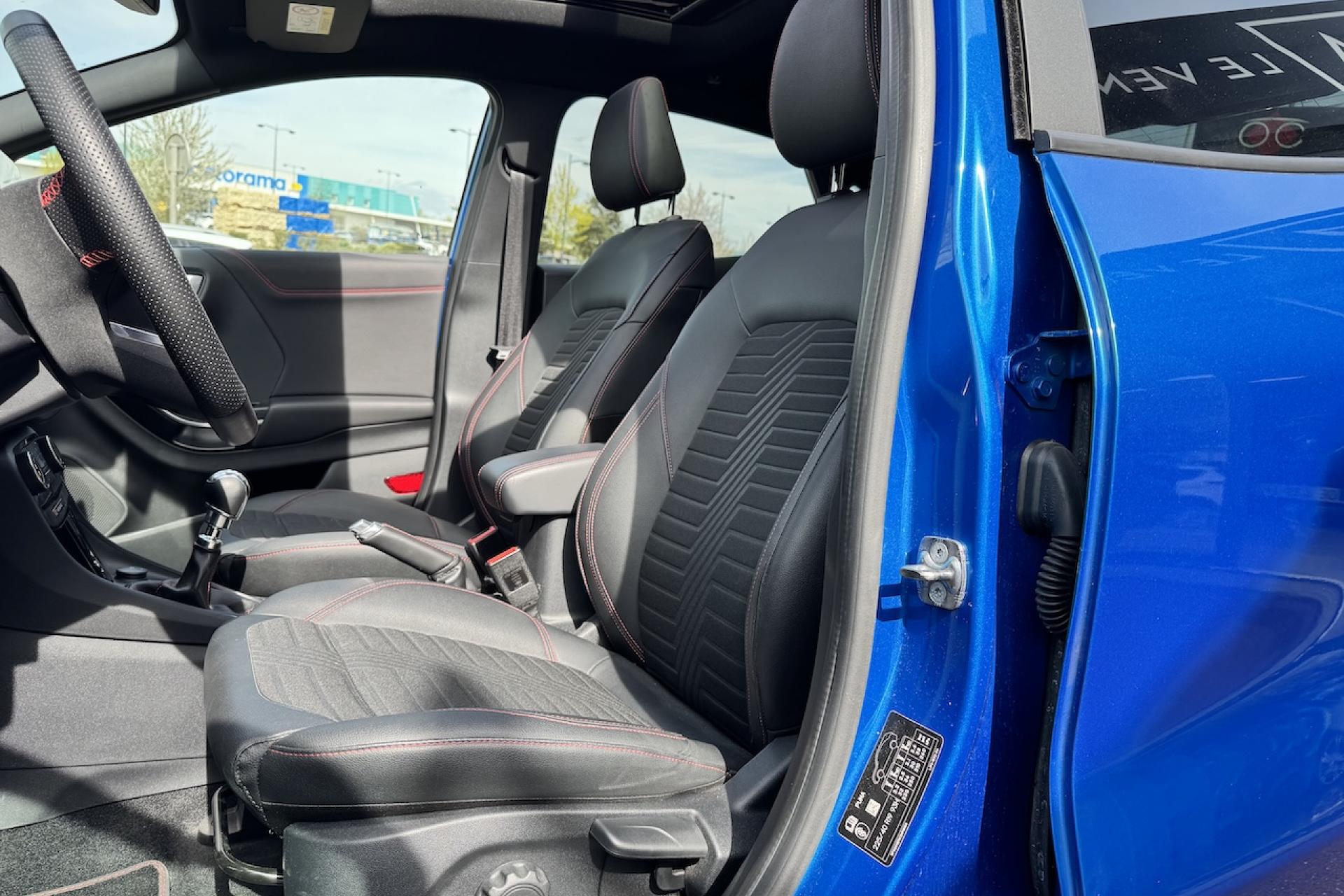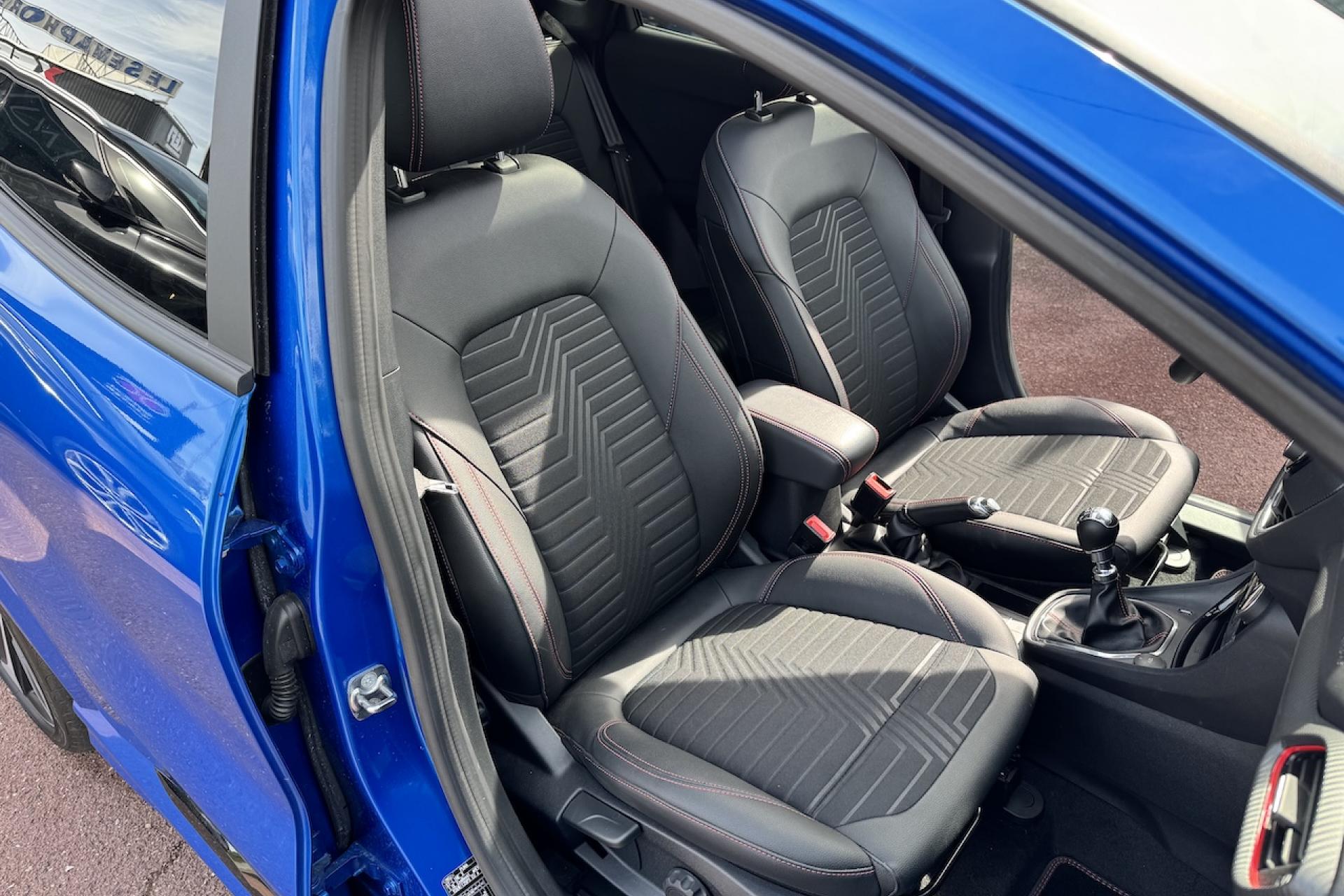 Aide au démarrage en côteAide au stationnement arrièreAlerte de franchissement Involontaire de ligneAllumage automatique des projecteursBadges ST-LineBouton de démarrage "Ford Power"Combiné d'instrumentation numérique 12,3" avec EcomodeFeux de jour à LEDFeux de route intelligents (passage feux de croisement/route automatique)Pack ConfortPlanche de bord en cuirSellerie Mixte noire tissu Sensico Tire on Eton avec renforts latéraux SalernoSystème audio B&O avec SYNC3 avec écran tactile 8", commandes vocales, 2 ports USB, Apple CarPlay et Android auto, 10 haut-parleursSystème de Navigation Europe et points d'intérêt MichelinSystème MyKey (seconde clé programmable)Vitres arrière surteintéesVitres électriques avant et arrière avec descente et remontée à impulsionVolant à méplat 3 branches ST-Line avec surpiqûres rouges
